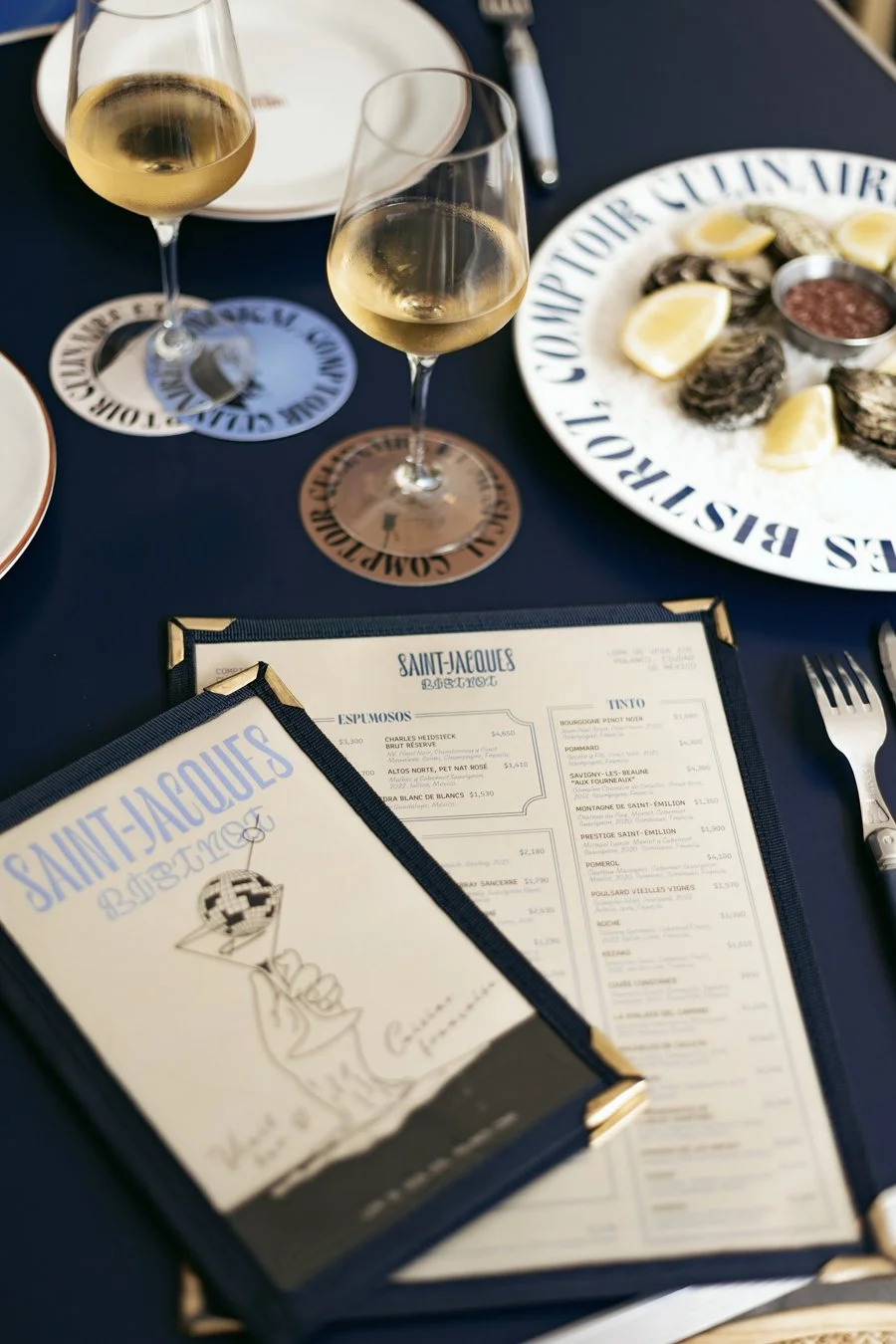 El comptoir también es una manera de honrar la tradición, al tiempo de atraer los gustos y sensibilidades actuales. La música, la mixología y la cocina francesa son los pilares de Saint-Jacques Bistrot, y forman parte de la iconografía seleccionada para su imagen de marca: ilustraciones que se incorporan de manera versátil en forma de murales, acentos decorativos —en vajillas, parches o uniformes—, o siendo parte de las diferentes piezas gráficas de comunicación. La paleta cromática está inspirada en el menú, formado por platos franceses que mezclan el campo y el mar.